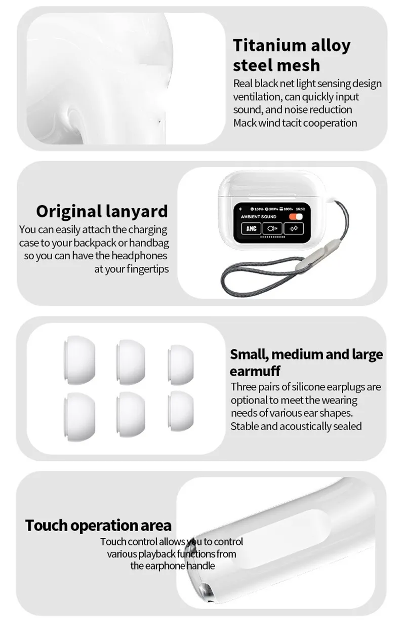 With A9 Air pods Pro with Touch Screen navigate through your music and settings effortlessly with our full-color LED screen. From adjusting volume to switching tracks, stay in control of your audio experience with ease and precision.